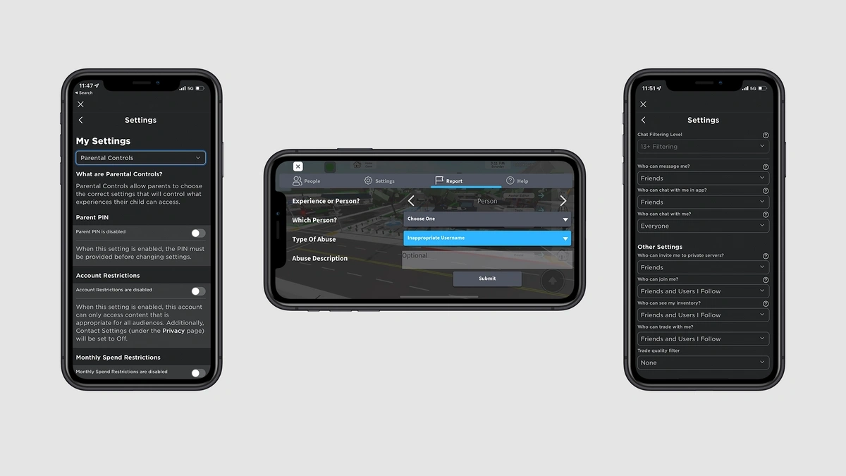 - Reporting: We also actively encourage our users to report any activity they feel uncomfortable or concerned about. Users can mute or block people acting negatively and report inappropriate content/behavior using our Report Abuse system located prominently throughout the site and in experiences.
