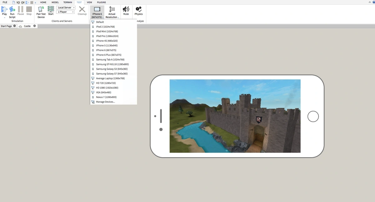 Developing, testing, and debugging games for a wide range of mobile devices is now easier with our newly enhanced emulator in Studio. This feature allows you to emulate the screen and touch interface (but not the hardware) of several mobile devices. With just a few clicks, you can immediately get a sense of what a mobile player would see once they boot up your game. In Studio, simply navigate to the Test panel, then use the drop-down menu in the Emulation section to select a device. We’ve made a lot of improvements to the emulator, so here’s the full list of changes: