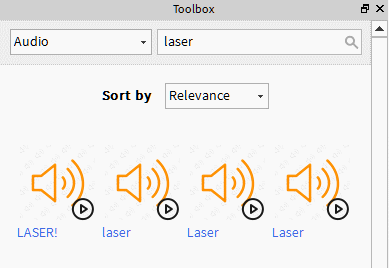 To find sounds, open the Toolbox, click the dropdown menu, and change the category to “Audio.” You can also preview a sound by clicking the play icon beside it.