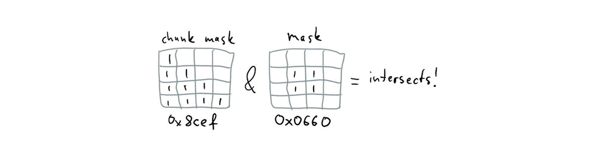 The query is two-step. First, we take the object’s AABB, expand it by 1 voxel to cover for objects touching geometry generated by overflowing into the neighboring voxel, project it to chunk space (by dividing the coordinates by 8 voxels), and convert the min/max to integer (using floor/ceil), which gives us the range of chunks. Then we take each chunk and inspect the bit data to see if the object’s AABB touches any bits marked as solid/water. While the latter could be implemented in a naïve way by querying each voxel in the object’s AABB, we take advantage of the bit data as follows.