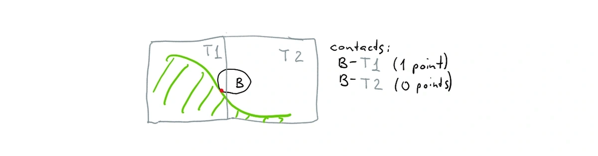 Whenever the object moves, we take the AABB of the object with the old and new transforms, query the broadphase for overlaps, and perform contact management. If the object had a solid contact with a chunk in the old position but no solid contact with that chunk in the new position, we can remove that contact. We track up to 1 solid and 1 water contact per object-chunk pair, so a very large object can end up having multiple contacts with terrain (and each contact can generate multiple contact points as a result of the narrowphase work that we’ll discuss later).