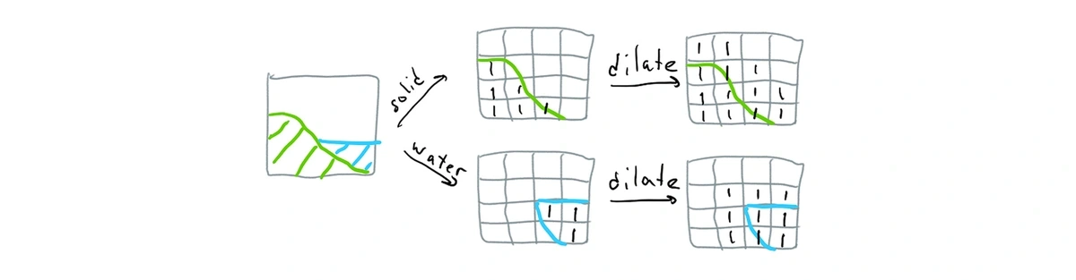 Finally, we have two types of contacts: solid and water (we use contacts between primitives and water to compute buoyancy), so we generate two bitmasks. The process works roughly as follows (note that for exposition the images in this article are assuming 4^3 chunks instead of 8^3):