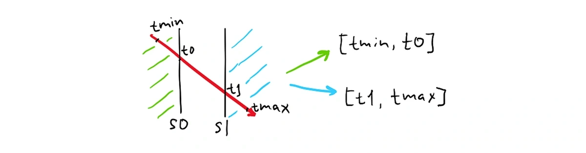 For ray queries, we choose to instead do a segment-tree traversal, where the segment is defined by the ray origin/direction and two limits for the parameter t, tmin and tmax, that contain all points within the subspace defined by each node. When we encounter a branch, we need to intersect the split planes with the ray (which is simple and fast since planes are axis-aligned), and adjust the t limits for subsequent traversal: