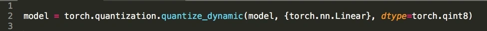 The Dynamic Quantization support in Pytorch 1.3+ was very easy to implement, and a one-line change in our code enabled the use of 8-bit integer representations of weights in all linear layers of the DistilBert model: