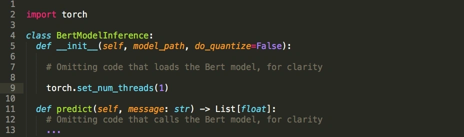 Fortunately, the remedy to this was simple: in each inference-performing worker process, we simply set the number of threads to 1 as shown in line 9 below.