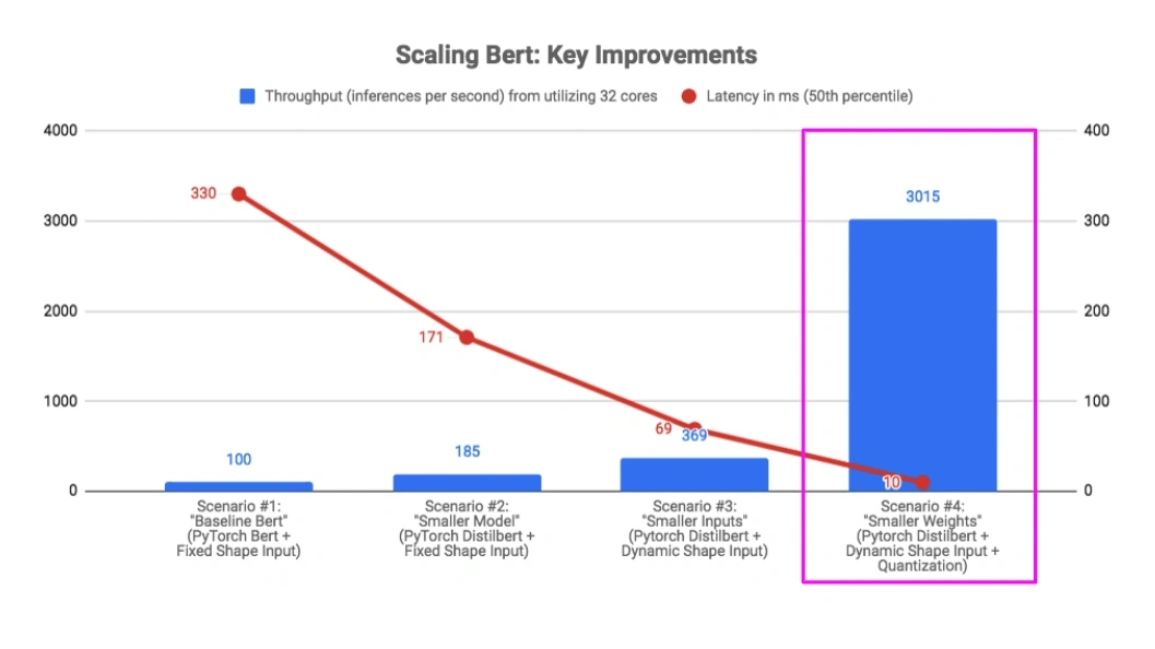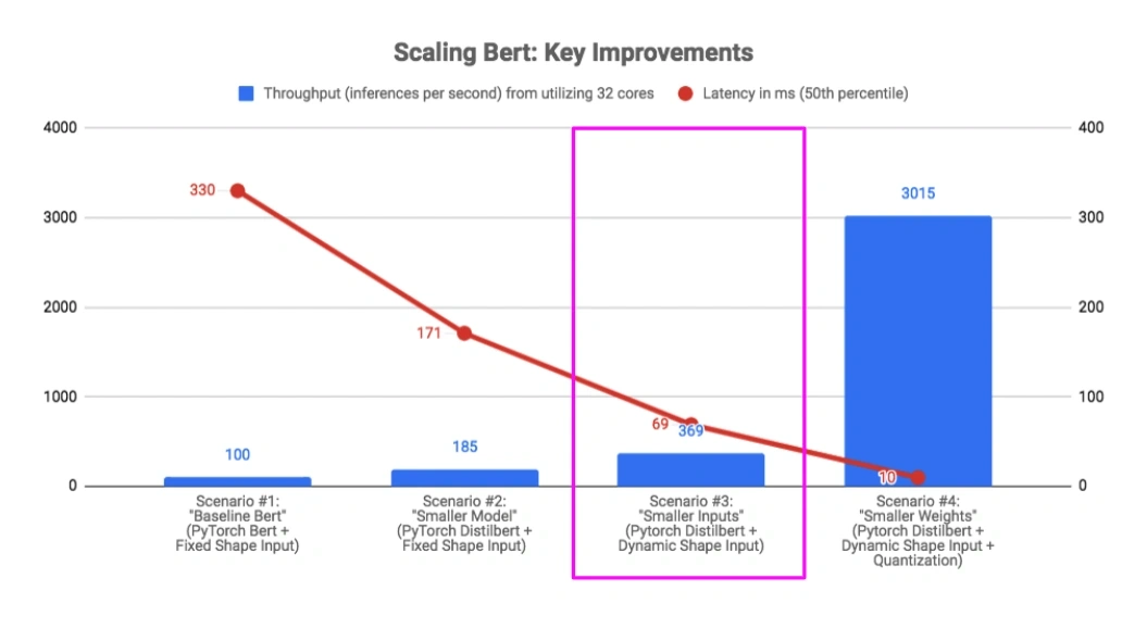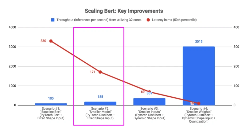 In the pink box below, we show the benchmark result for this “Bert Baseline” scenario. Even at 330ms, the latency was too high for our production needs, and the throughput was terrible for the number of cores being utilized by the benchmark.