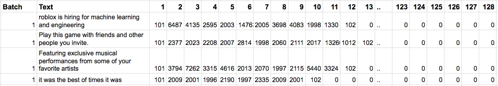 First a little background on zero-padding. A deep learning model generally expects a batch of tensors as input. For our text classifier this means representing textual input as a tensor through Bert tokenization, then batching those tensors. Since text is variable in length, we must also zero pad the resulting variable-length tensors to produce a fixed-shape batch, such shown here: