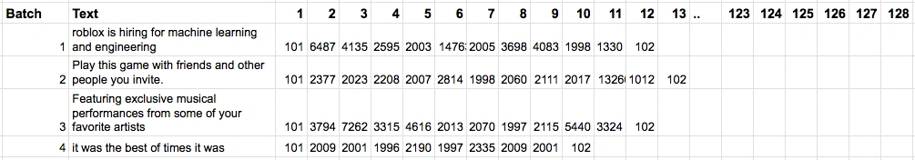 As mentioned earlier, our text classifier operates in a real-time request-response setting. As such, our ideal batch size is 1. The implication is that we did not need to zero-pad the tensors at all, since all tensors have the same size when the batch size is 1. Here is what the input texts from above looked like when we sent them to the model in separate batches with no zero padding: