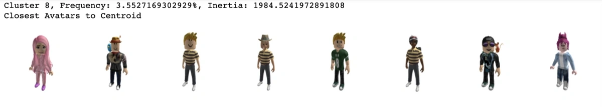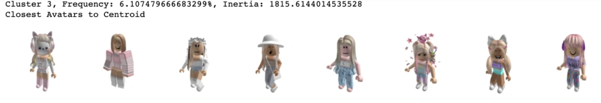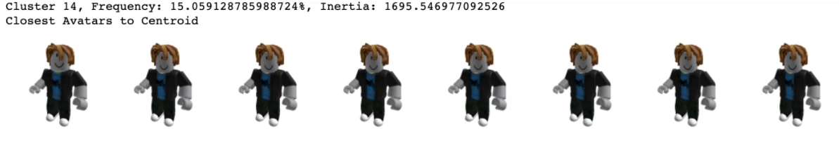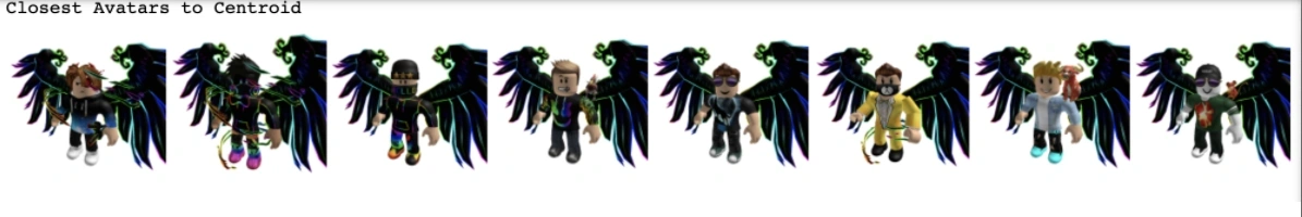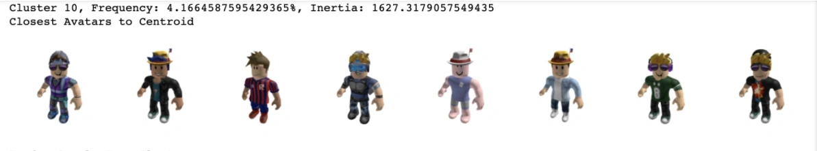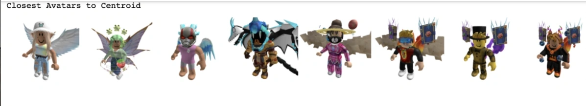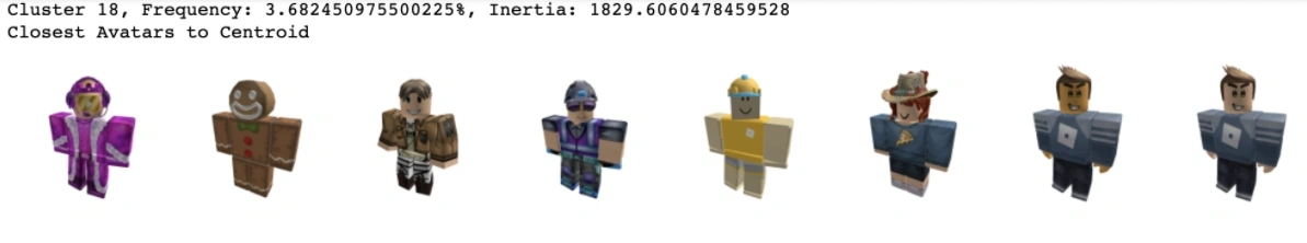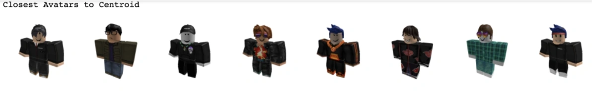 The consistency of the clusters across multiple runs, random initializations, and choices of k suggests that Avatars naturally fall into distinct (albeit fuzzy) categories. On the extremes of contour, we have the old-fashioned, square-bodied “Blocky” characters opposite the tall, thin, more lifelike “Rthro” avatars. We also find a number of default avatars, which users have not edited since joining Roblox (cluster 4 above). In between, there’s everything from “goth ninjas” to “going clubbing.”
