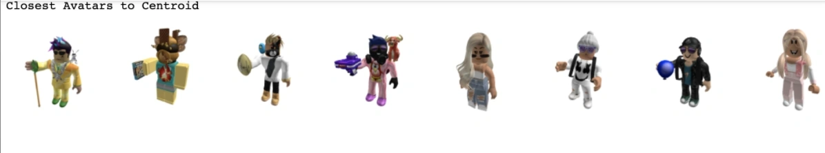 4. Training a small custom variational autoencoder (VAE) on the thumbnail data directly. Ideally, this better captures the unique aesthetic variation in Roblox avatars, as compared to a general-purpose image classifier. (cute aside: K-means is particularly appropriate for clustering these embeddings, as its normal prior matches up with the VAE’s latent variable posterior)