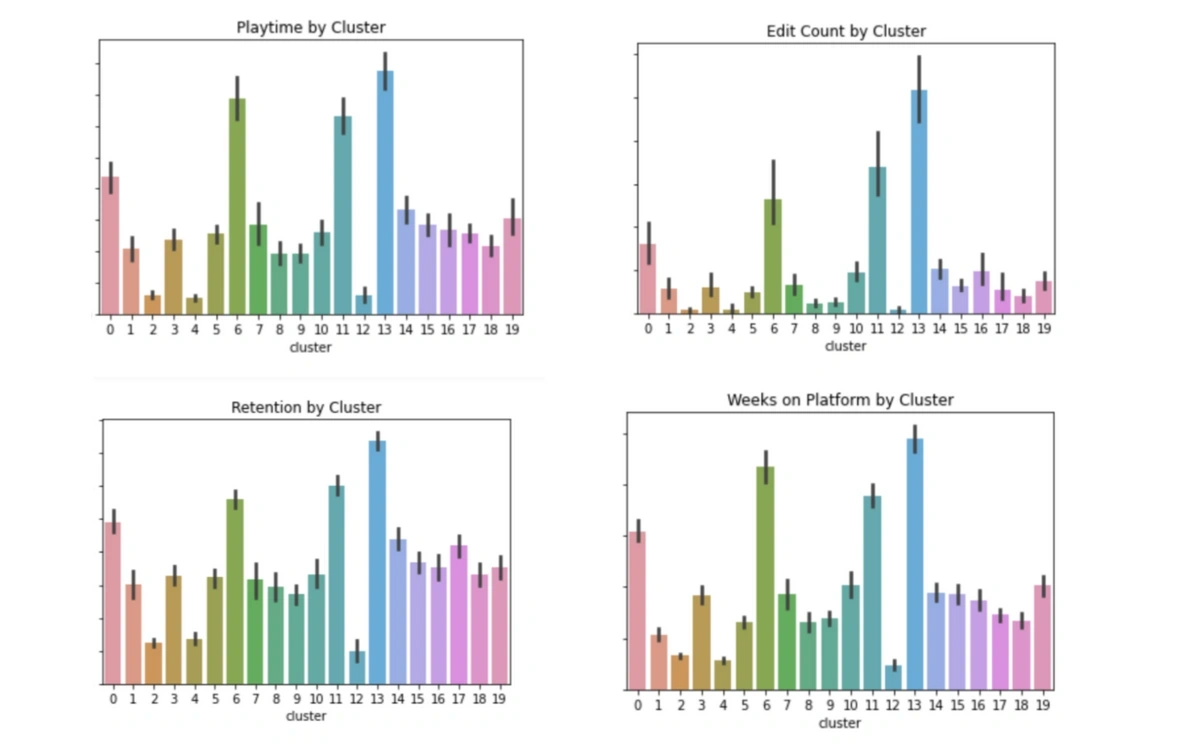 The easiest place to start is user behavior on the platform. When plotting avatar edits in the last month, account age in weeks, total seconds of playtime, and one-month retention by cluster --- engagement indicators --- we are presented with four graphs that demonstrate dramatic variation across clusters. Users with heavily customized avatars tend to be most engaged and most frequently retained, while the avatars that haven't been as heavily customized tend to be less engaged.