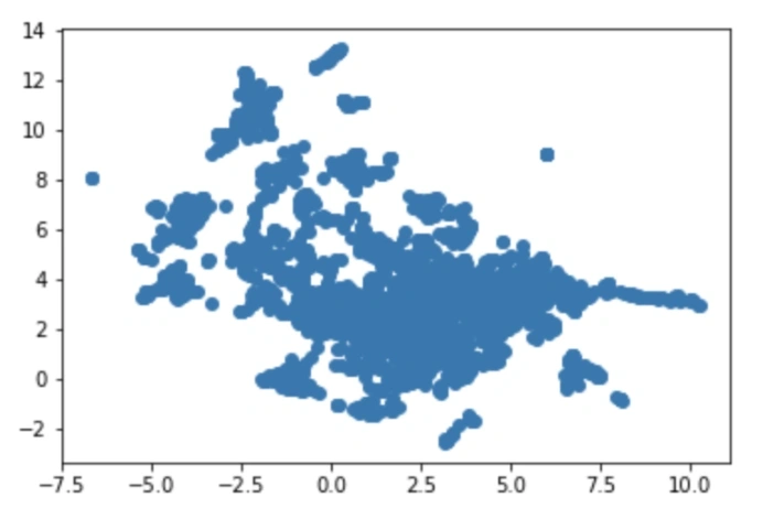 3. To get a visual read on cohesiveness, we can apply UMAP to reduce the image classification embeddings all the way down to 2 dimensions. While there dose seem to be discernible clusters, the large blob of points in the bottom right looks suspicious. Rightly so: samples from that megacluster are visually incohesive.