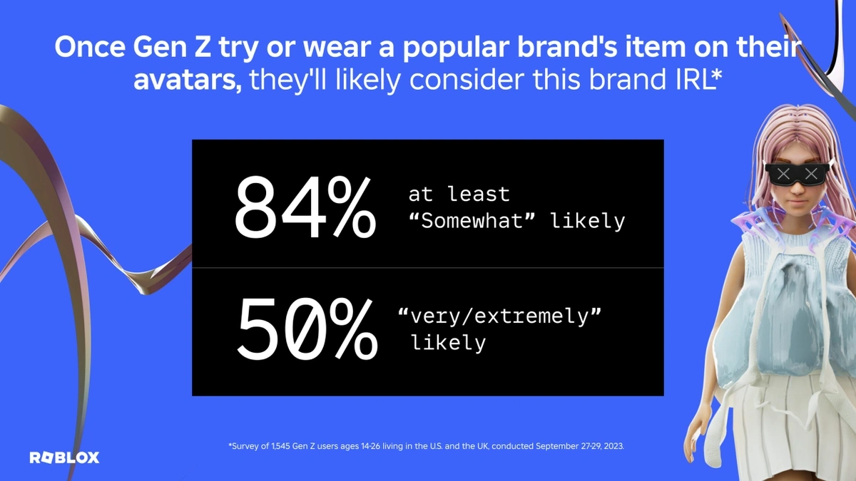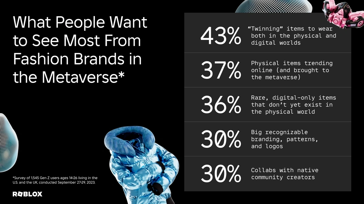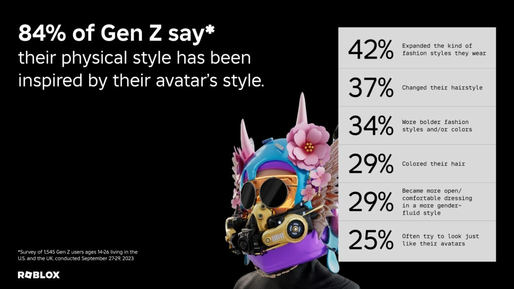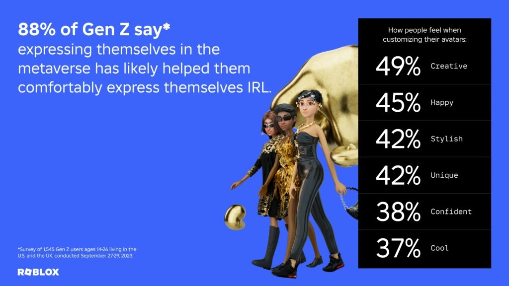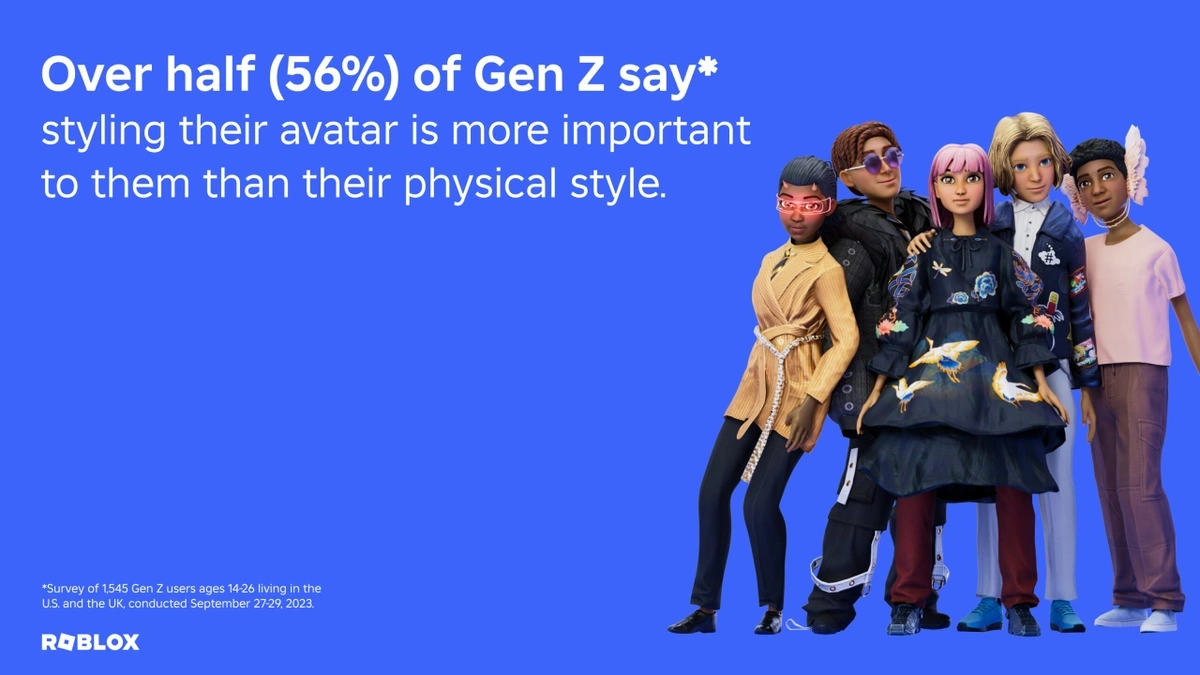 These findings echo what we see on our platform: self-expression through digital identity and fashion is an essential part of people’s experience. For example, during the first three quarters of 2023 on Roblox, there were a total of 165 billion avatar updates, up 38% year over year, and people bought nearly 1.6 billion digital fashion items and accessories, up 15% year over year. Plus, millions of Roblox users continue to update their avatars every day.
