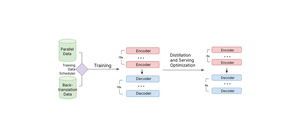 Less common translation pairs (say, French to Thai), are challenging due to a lack of high quality data. To address this gap, we applied back translation, where content is translated back into the original language, then compared to the source text for accuracy. During the training process, we used iterative back translation, where we use a strategic mix of this back translated data and supervised (labeled) data to expand the amount of translation data for the model to learn on.