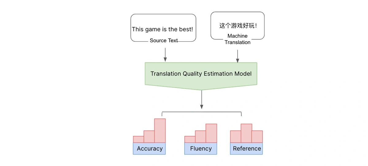 We look at this from multiple aspects, including accuracy (whether there are any additions, omissions, or mistranslations), fluency (punctuation, spelling, and grammar), and incorrect references (discrepancies with the rest of the text). We classify these errors into severity levels: Is it a critical, major, or minor error? In order to assess quality, we built an ML model and trained it on human labeled error types and scores. We then fine-tuned a multilingual language model to predict word-level errors and types and calculate a score using our multidimensional criteria. This gives us a comprehensive understanding of the quality and types of errors occurring. In this way we can estimate translation quality and detect errors by using source text and machine translations, without requiring a ground truth translation. Using the results of this quality measure, we can further improve the quality of our translation model.