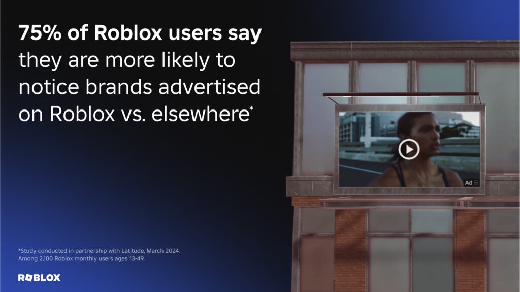 - 75% of Roblox users say they are more likely to notice brands that advertised on Roblox vs. elsewhere.