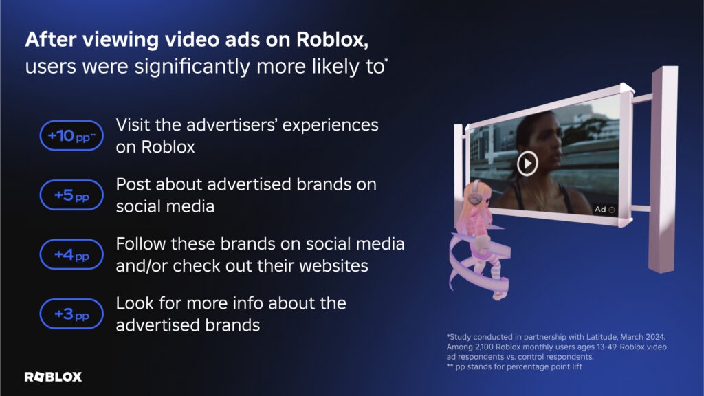 * Study conducted via Latitude March 20-27, 2024 among 2,100 U.S. respondents who spend time on Roblox at least monthly, including 300 in the control group and 1,800 users ages 13-49 exposed to immersive video ads from multiple brands across different consumer categories on the platform. Results based on Top 2 box where applicable.