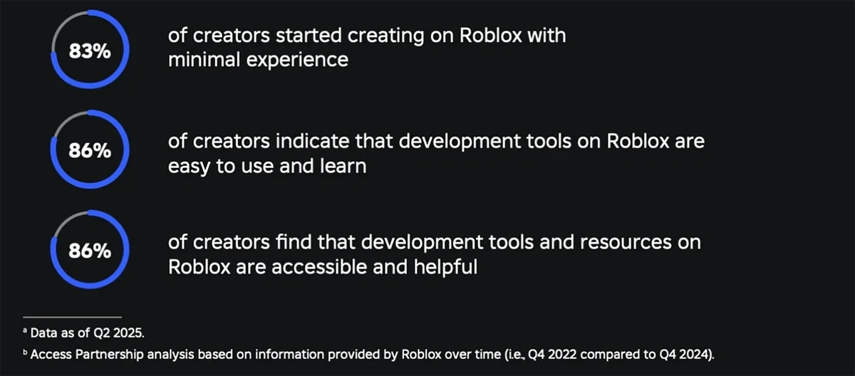 Roblox creators, who design experiences, avatars, and accessories on the platform, live all around the world. Through Roblox Studio and our Roblox Developer Exchange (DevEx) Program, Roblox creators develop and monetize the digital assets they create. This year, as of September 2025, developers had earned over $1 billion1, compared with $923 million for the full year in 2024. This underscores the growing economic opportunity provided by the platform, where millions of creators have the opportunity to build a thriving business.