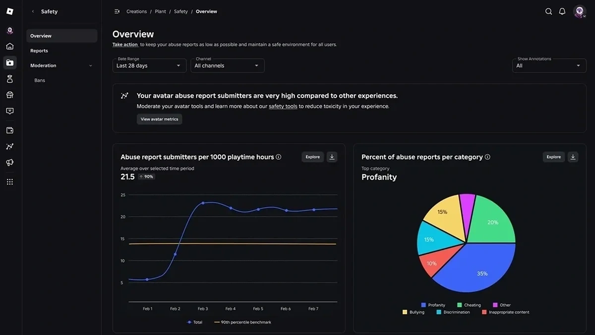 Ürünlerimizde değişiklikler yaparak geliştiriciler için bilgiler sunuyoruz: Geliştiricilere oyunlarında gönderilen kötüye kullanım raporları (ör. küfür) hakkında bilgi sağlamak için yeni bir panoyu kullanıma sunduk. Bu, deneyimlerini uygar tutmak için özellikleri geri alma, denetimi iyileştirme veya daha fazla kullanıcı eğitimi sunma gibi eylemlerle harekete geçmelerini sağlar.